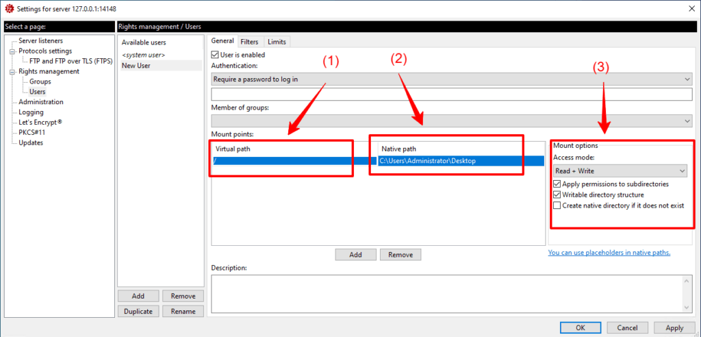 Cài đặt đường dẫn và quyền của User như hình bên dưới với (1) đặt đường dẫn cho từng User, có thể “/” để User có thể vô thư mục gốc, (2) cài đặt đường dẫn của máy cài FileZilla Server mà User có thể vào bằng FTP, (3) Tùy chọn phân quyền cho User khi truy cập vào FileZilla như FTP bình thường